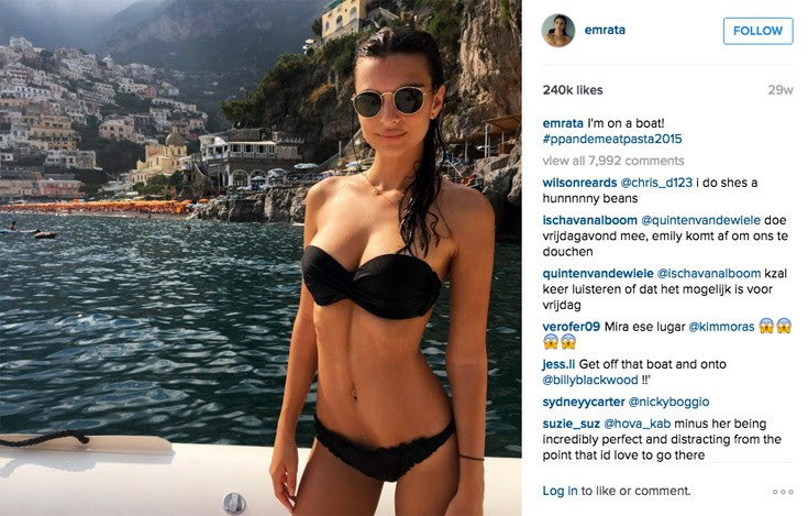 Απολαμβάνει τον ήλιο και τη θάλασσα, ενίοτε και την πισίνα, βγάζει selfies, ποζάρει για να την βγάλουν οι φίλοι της ή ατενίζει τη θέα δείχνοντας πώς είναι η πίσω πλευρά του μαγιό της. Και έτσι καταφέρνει να μαζέψει χιλιάδες likes και σχόλια και ίσως και κάποια χιλιάδες δολάρια στο λογαριασμό της μιας και το Instagram χρησιμοποιείται πλέον πολύ συχνά από τους celebrities ως μέσο διαφήμισης προϊόντων. Αυτό δεν φαίνεται να πτοεί βέβαια τους εκατομμύρια θαυμαστές της Ratajkowski που την βομβαρδίζουν με κολακευτικά σχόλια για το κορμί αλλά και το πρόσωπό της.